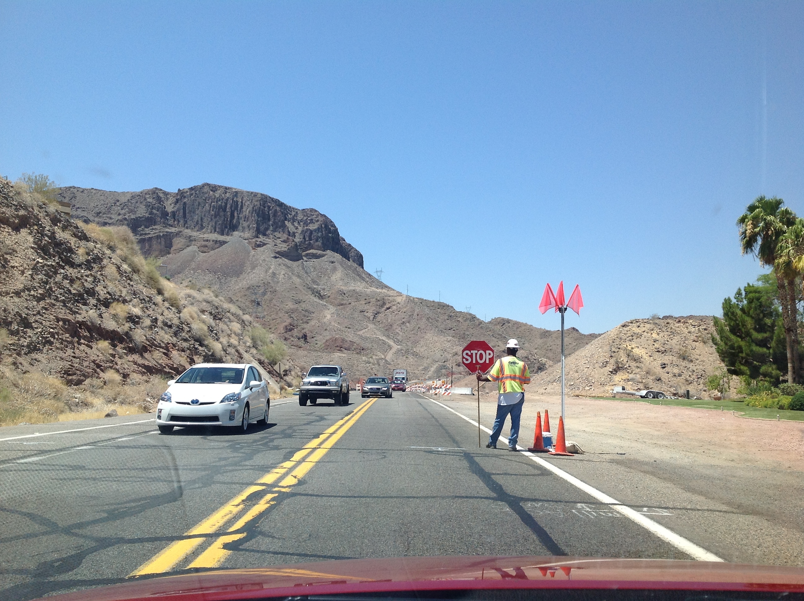 Gårdagens grandiosa skådespel förbyttes idag mot enformighet. Alla filmer med klipp från öknen i Arizona – vackert som ett vykort, men såååå långtråkigt. När man har kört rakt fram i minst en halvtimme, då är minsta lilla kurva välkommen!